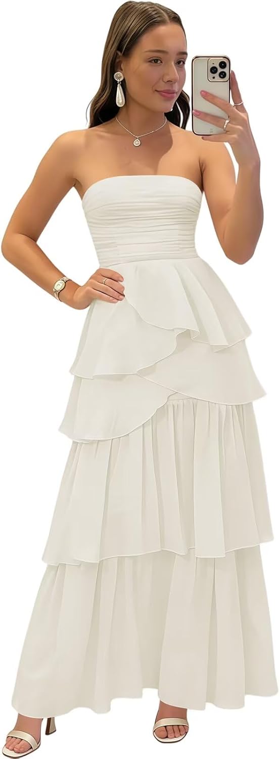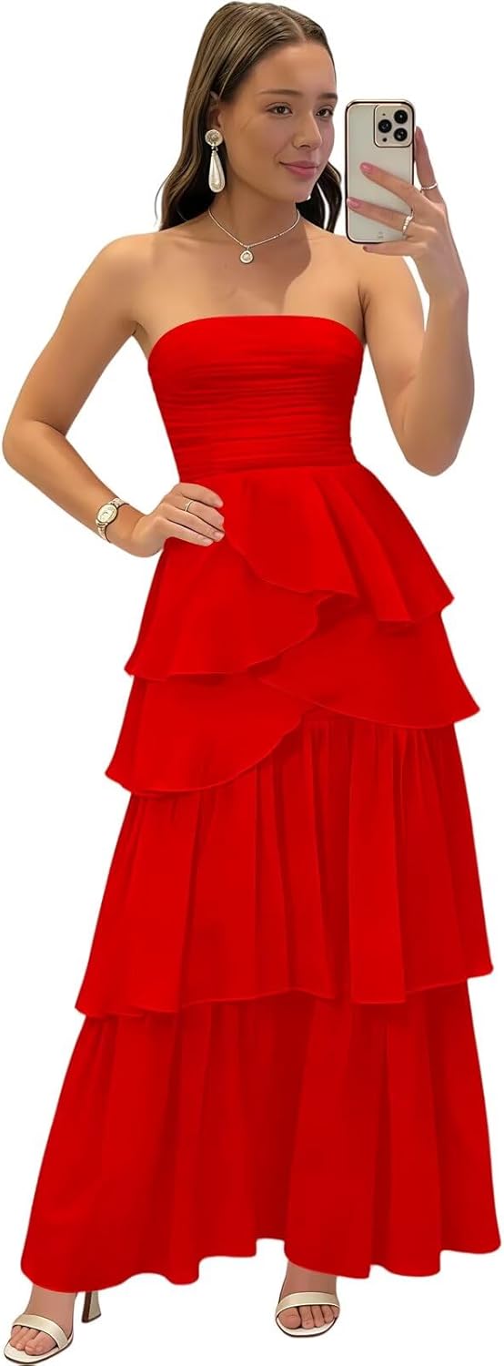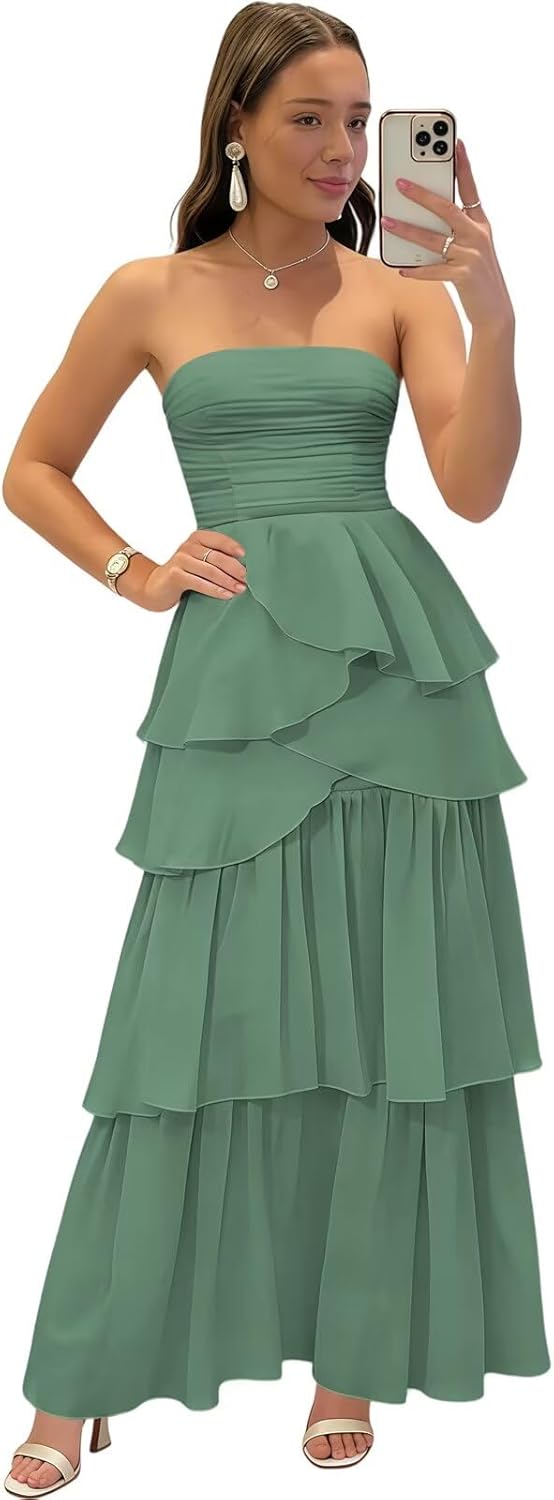 Tiered Prom Dresses Long Ruffle Chiffon Strapless Formal Bridesmaid Dress HOW TO CHOOSE A CORRECT SIZE of this Prom Dress? 1:Measure your waist ,bust ,hips size and compare with our own size chart. 2:If your measurements are between two sizes, please choose the bigger one. 3. We provide free customized service, just send your accurate measurements as follow. - Bust (the biggest circle of chest) - Waist - Hip (the biggest circle of hip) - Hollow to Floor - Natural Height without shoes - Heels Height