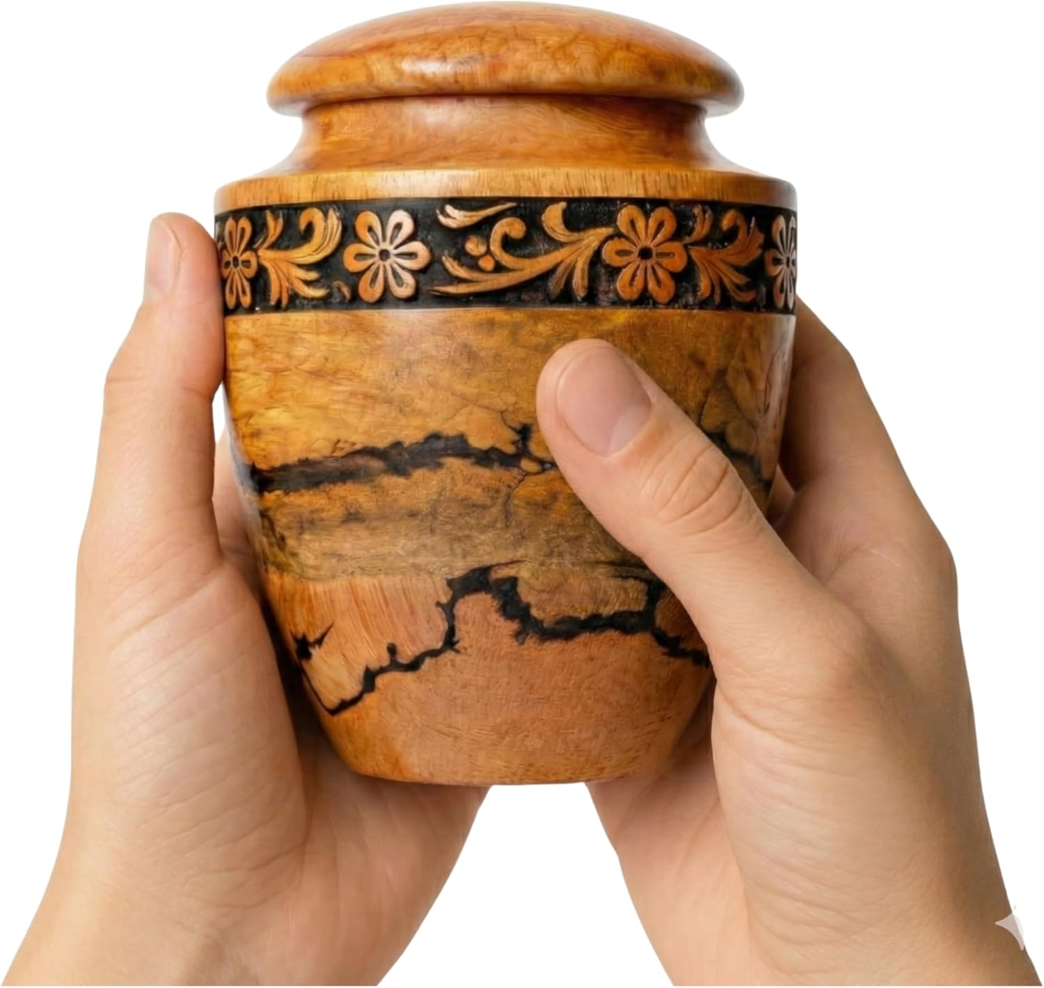 | Pre Printed Text | Handcrafted Wooden Cremation Urn With Fractal Pattern And Floral Band |