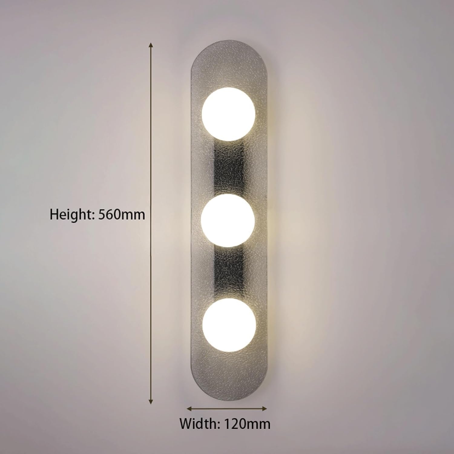 Product Parameters:Type: Wall Sconce / Wall LampStyle: Modern, Minimalist, Contemporary, Nordic, Linear, Rounded Rectangle, 3-Globe, Decorative, Ambient LightingMaterial: Iron (backplate, black finish), Glass (frosted spherical lampshades)Color: Black (backplate), Frosted White (glass globes)Dimensions:Height: 22.0" (56cm)Width: 4.7" (12cm)Optimized Special Feature: This modern minimalist wall luminaire features a sleek rounded rectangular iron backplate, complemented by three frosted spherical glass globes. it casts a soft, even glow, creating inviting ambient lighting. Its clean linear design and contemporary aesthetic make it an ideal decorative accent for living rooms, bedrooms, corridors, or restaurants, enhancing any space with a touch of modern simplicity.Applicable Space: Ideal for Living Room, Bedroom, Bedside, Corridor, Hallway, Entryway, Dining Room, Restaurant, Hotel Rooms, or any space desiring modern minimalist design, elegant ambient lighting, and a sophisticated decorative touch.